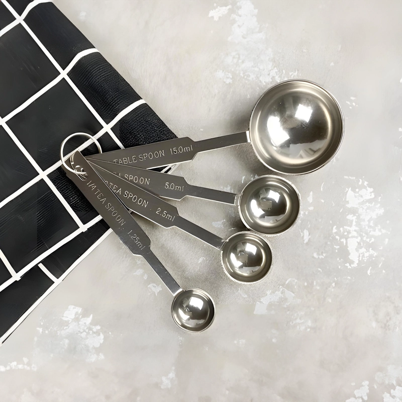 4入不鏽鋼量匙是用高級不鏽鋼製成的,具有耐用和耐腐蝕的特性。它包含了不同容量的量匙,包括1.25毫升(1/4茶匙)、2.5毫升(1/2茶匙)、5毫升(1茶匙)和15毫升(1湯匙),能夠滿足不同食材的量測需求。